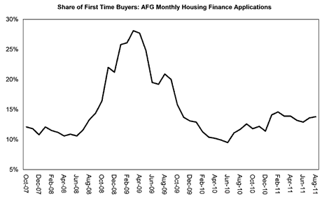 The second chart of interest illustrates the share of first-time buyers as a proportion of all borrowers. According to AFG, this hit a low of 9.5% in June 2010 and has gradually increased since to 13.8% in August 2011 (the enormous protrusion in the middle of the chart depicts the stimulatory effects of the government's first-time buyer boost). That is to say, there is some early evidence that first-time buyers are returning to the market given the improvement in housing affordability (ie, lower house prices in concert with robust disposable income growth). Click to enlarge