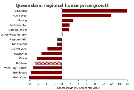 Regional areas have outperformed capital cities in the year to March, according to ANZ, with Gladstone leading the way in Queensland.