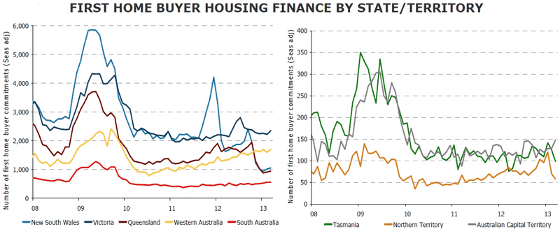 "The withdrawal of the First Home Buyer Grant on established homes in NSW and Queensland and the unwinding of Northern Territory first-home buyer concessions have weighed on first- home buyer lending in these states.