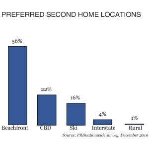A survey carried out last year of 2000 home owners and investors by PRDnationwide found that people who wanted a second home were nearly four times as likely to buy a beachfront property as a ski lodge. CBD apartments were also more popular locations for second homes.