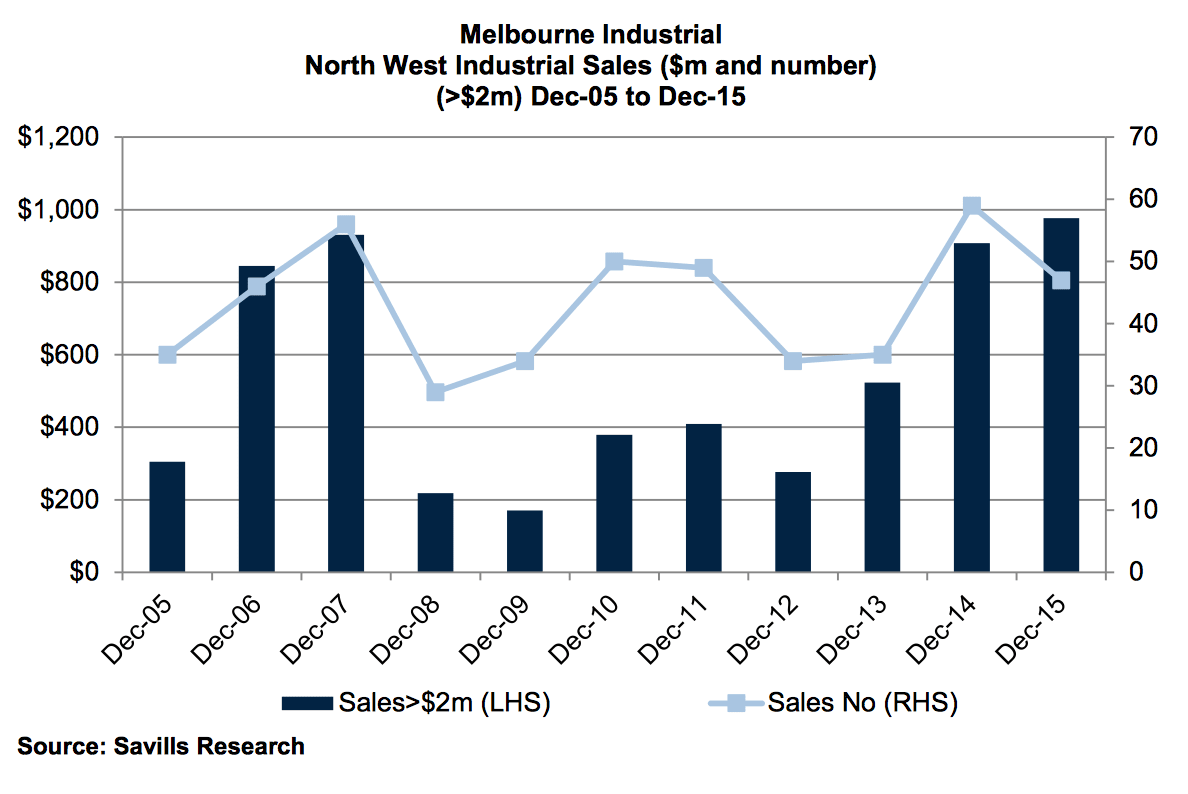A total of 135 industrial properties were sold over the year to December 2015 with a total value of $,1,894 million, with Melbourne's North West region netting the greatest dollar volume, according to Savills.