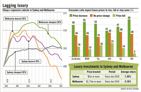 Click to enlargeI love reading articles about the top-end property market – Home owners confident but luxury market loses lustre. A great read by Christopher Joye, which clearly identifies that NSW remains the most bullish top-end market in Australia. Mosman is arguably performing the best of Australia’s entire top-end suburbs, with reports our office has posted another double-digit sale getting stronger and stronger. When property markets are in a downward correction mode, the top-end gets punished the most, but when it starts to recover it always posts the fastest capital appreciation. Historically, top-end property markets perform at optimum levels when a Liberal government is in power, so we sense a hedging of bets on the basis that Australia will go to the polls in March 2013.