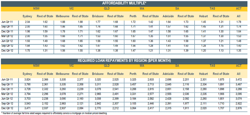 Overall housing affordability improved by 5.5% over the 2012 December quarter representing an 18.4% advance on the same period of 2011.