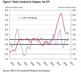 When interest rates do eventually fall, as they will, there will be an enormous affordability dividend dropped on the housing market, which will likely trigger strong upward movements in prices (in late 2012-14) as the market signals to builders that they need to get their arses into gear and start constructing more housing. In the interim, the RBA is going to be left to deal with significant rent inflation (chart via Citi).