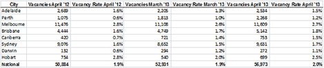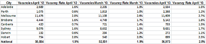 - Hobart has however, recorded the highest monthly increase in vacancies, rising by 0.5% during April 2013.