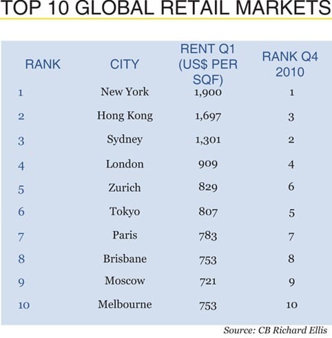 The latest CB Richard Ellis Global Retail MarketView ranks Sydney’s super prime retail locations (equivalent to rents paid for the best street-front space on Pitt Street Mall) as the third most expensive high street destination at $US1,301 per square foot per annum, behind New York’s Fifth Avenue (US$1,900 per square foot) and Hong Kong’s Pedder Street (US$1,697 per square foot).