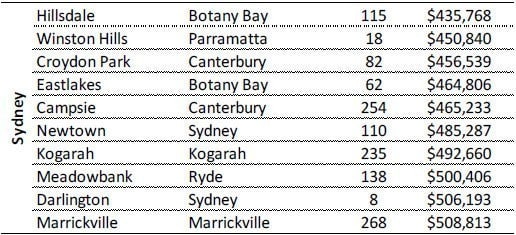 For inner city units, the busiest of the 10 cheapest suburbs was again Marrickville, with 268 units sold last year. The suburb is the 10th cheapest in the Sydney inner-city for units, with a median sale price of $508,813.