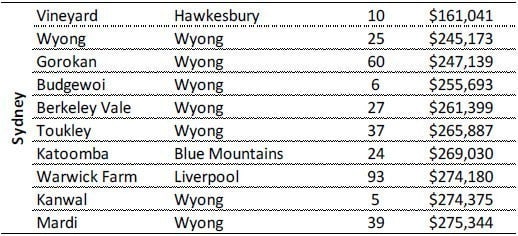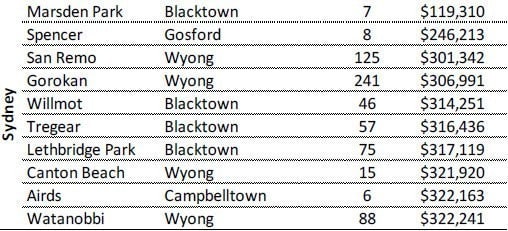 For houses, Marsden Park is the cheapest Sydney suburb, with a median price of $119,310. However, the suburb only saw seven homes sold in the past year. Far busier was Gorokan, with 241 houses sold in 2014. With a median house price of $306,991, it is the fourth cheapest suburb in Sydney.