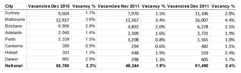 11,106 vacancies representing a 2% rental vacancy rate compared with 9,504 vacancies a year earlier in December 2010.