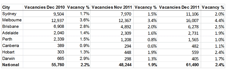 16,007 vacancies representing a 4.4% rental vacancy rate compared with 12,937 vacancies a year earlier in December 2010.