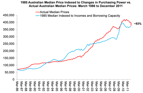 This analysis asks a simple question: if one took the median Australian house price way back in 1985, and indexed it to (1) the change in disposable incomes per household over time, and (2) any changes in borrowing capacity resulting from variations in mortgage rates, how would this “new” 1985 price compare to actual median prices in 2011?