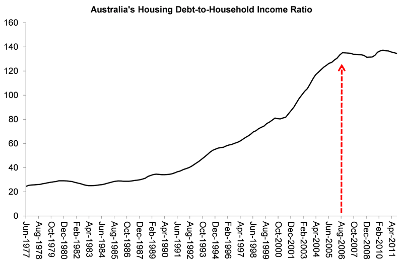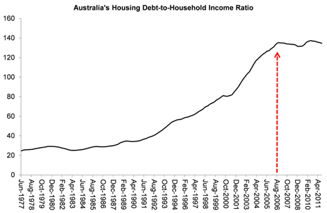 In this context, it is instructive to observe that Australia’s housing debt-to-income ratio rose from circa 40% in the early 1990s to a little over 130% by 2006. Since that time the debt-to-income ratio has flat-lined (see the second chart below). This tells us that housing credit is tracking incomes, which is what we should expect, all else being equal.
