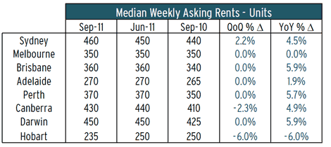 Brisbane and Darwin recorded the largest increase in median weekly asking rentals for units over the year to September, both increasing by 5.9%.