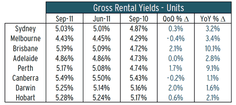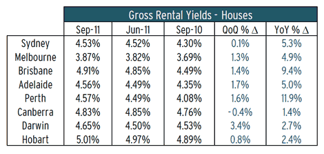 The softening in property prices evident through 2011 has meant that gross rental yields increased marginally despite subdued capital city rental growth over the September quarter.