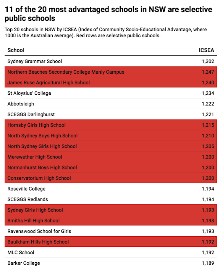 As the table below shows, in 2016 just over half of the 20 most advantaged high schools in NSW were selective schools.