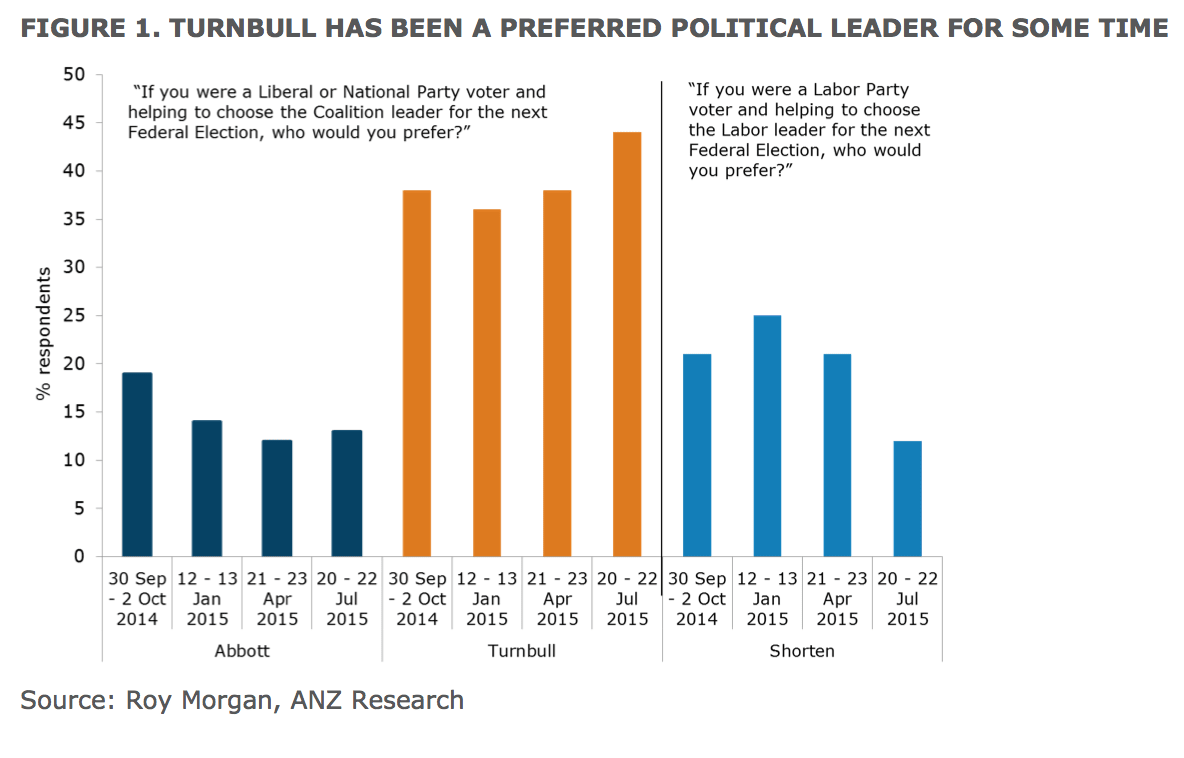 The firmness of the vote (Turnbull won 54 votes to Abbott’s 44), Turnbull’s standing in opinion polls (Figure 1), and his perceived centrist policies provide him with a good base to meet business approval.