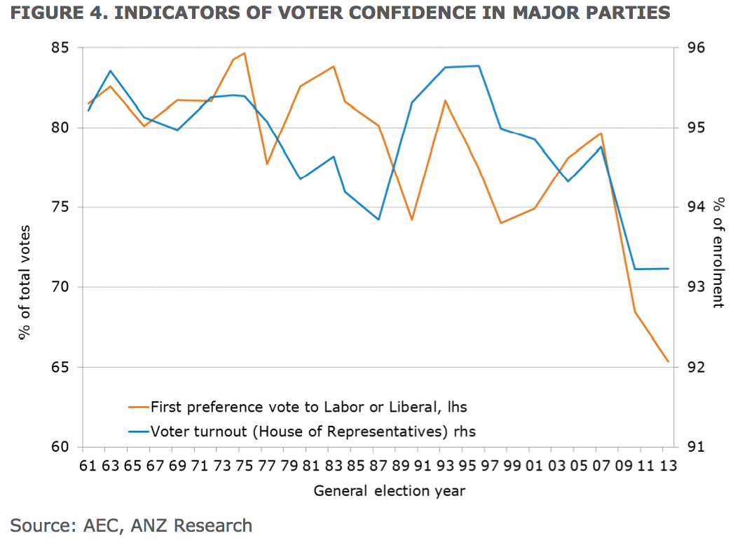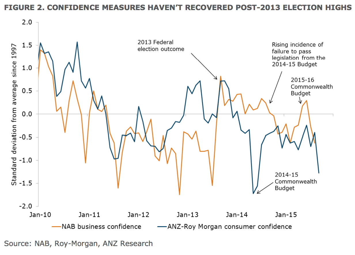 Turnbull has the opportunity to positively influence business and consumer confidence in the short term. There has been a general lack of optimism around government for some time (Figure 4). When the Coalition came to government, business confidence surged to a three year high, but has been unable to maintain that level, and is currently below average (Figure 2).