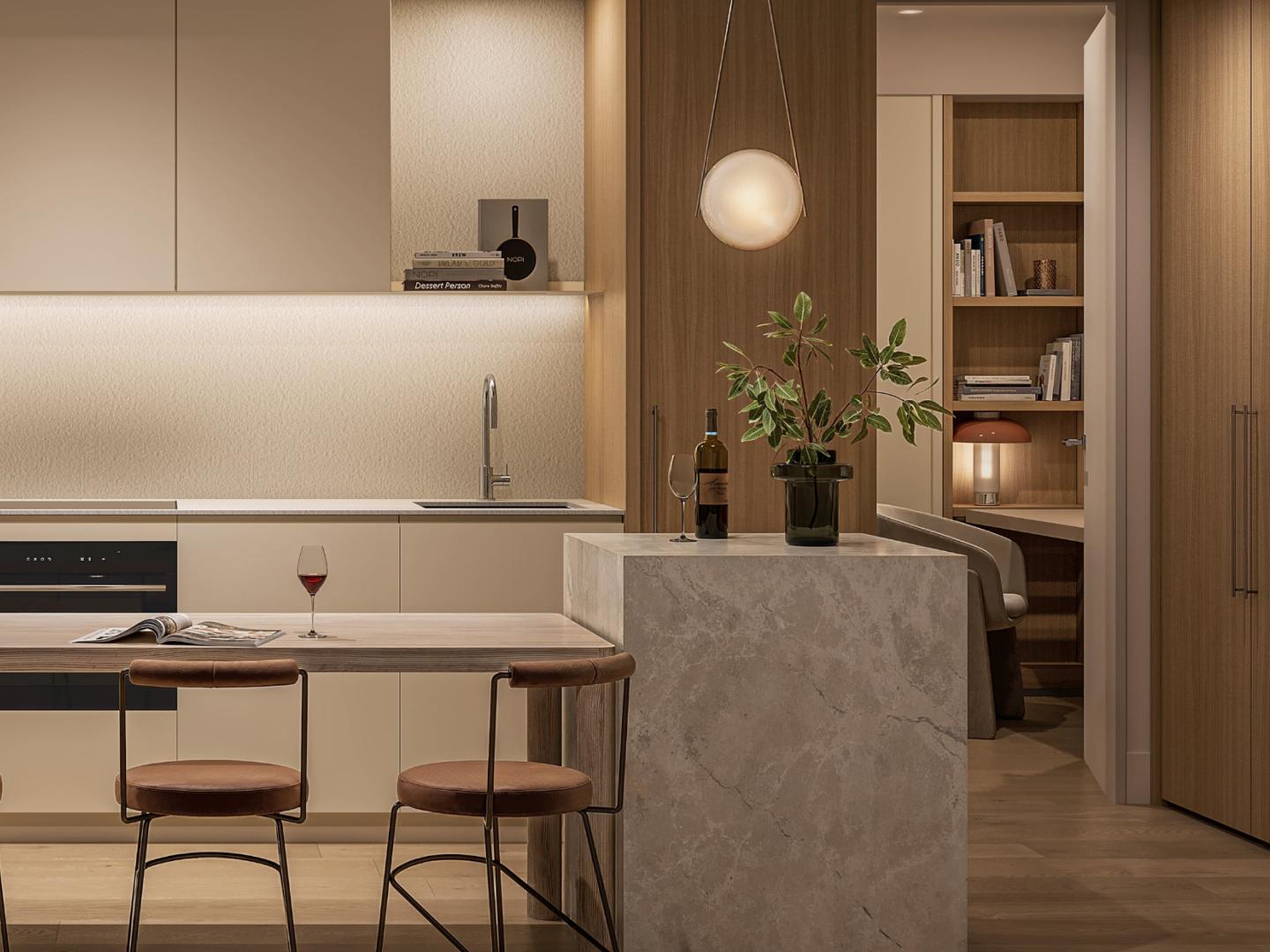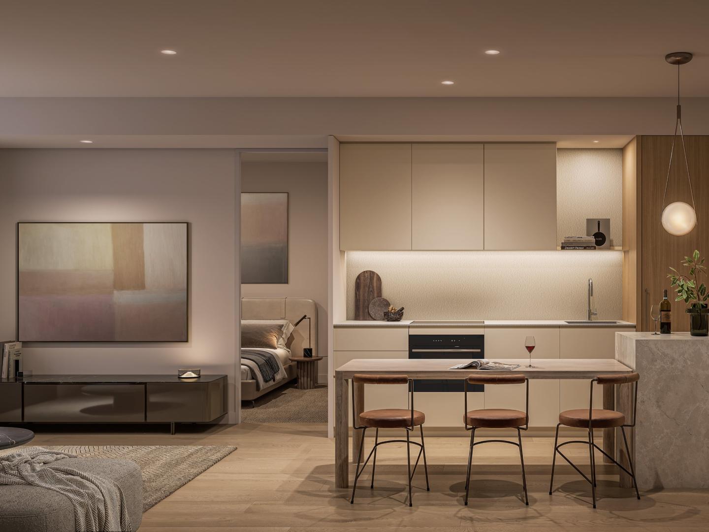 Inspired by the best of apartment living worldwide, every element of the apartments has been curated to create a home that feels both inviting and sophisticated. Interiors include engineered timber floors, stone and porcelain finishes and custom cabinetry. The kitchen offers residents a choice of two exquisite tables, ensuring personalisation and functionality in equal measure.