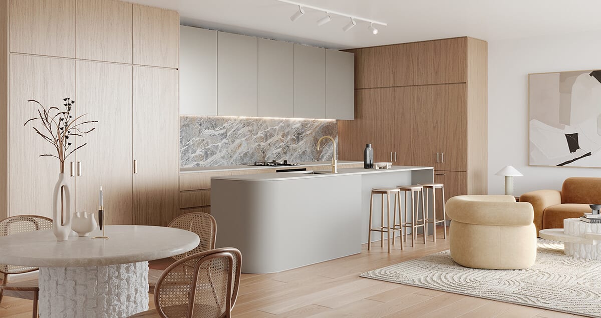 Each apartment in Calypso has been expertly crafted to offer the highest quality interiors with luxurious finishes. Renowned Australian interior designer Darren Palmer has meticulously designed the spaces to create an environment that is both functional and elegant. The open-plan living areas are filled with natural light, courtesy of high ceilings and expansive windows. The homes feature contemporary colour schemes with three distinct palettes to suit a variety of tastes, from light oak to sleek, mid-toned greys.