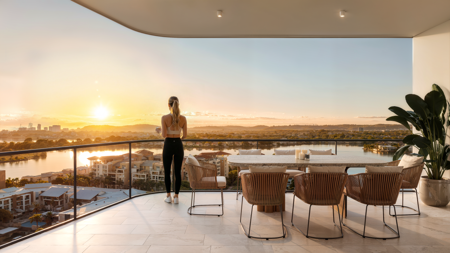 Expansive private balconies take advantage of views to Lake Orr, City Skyline & GC Hinterland.