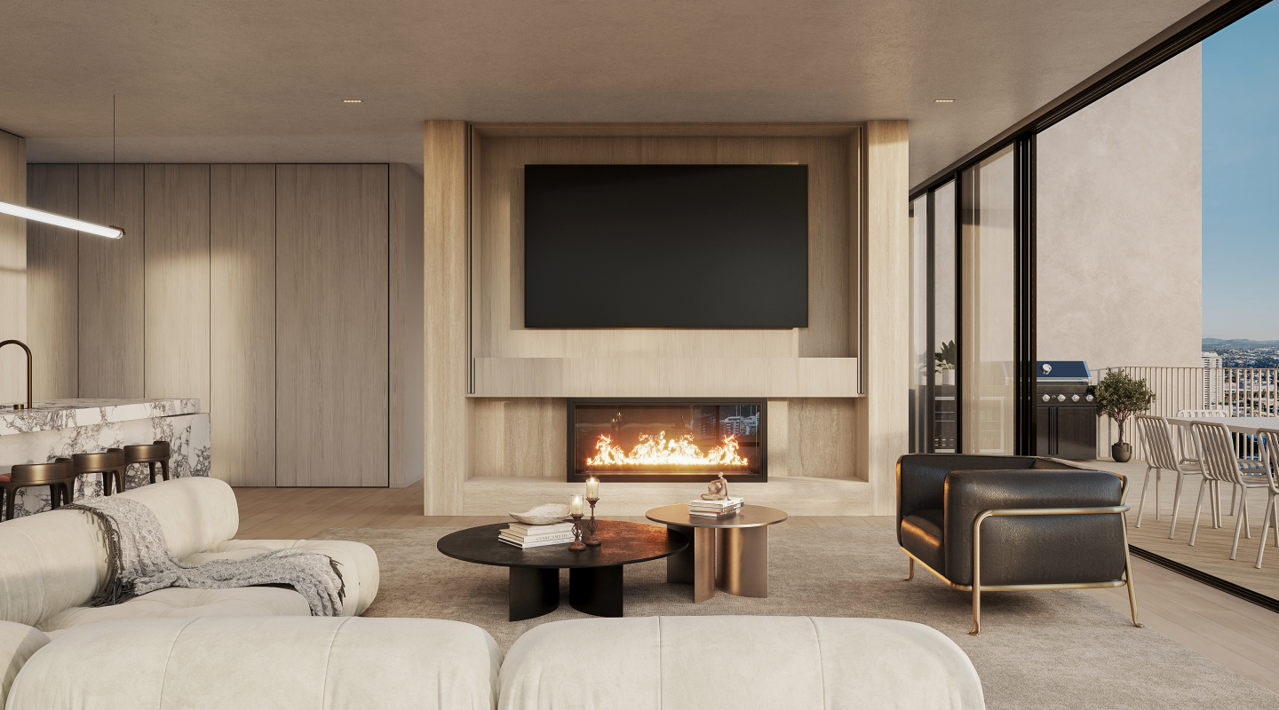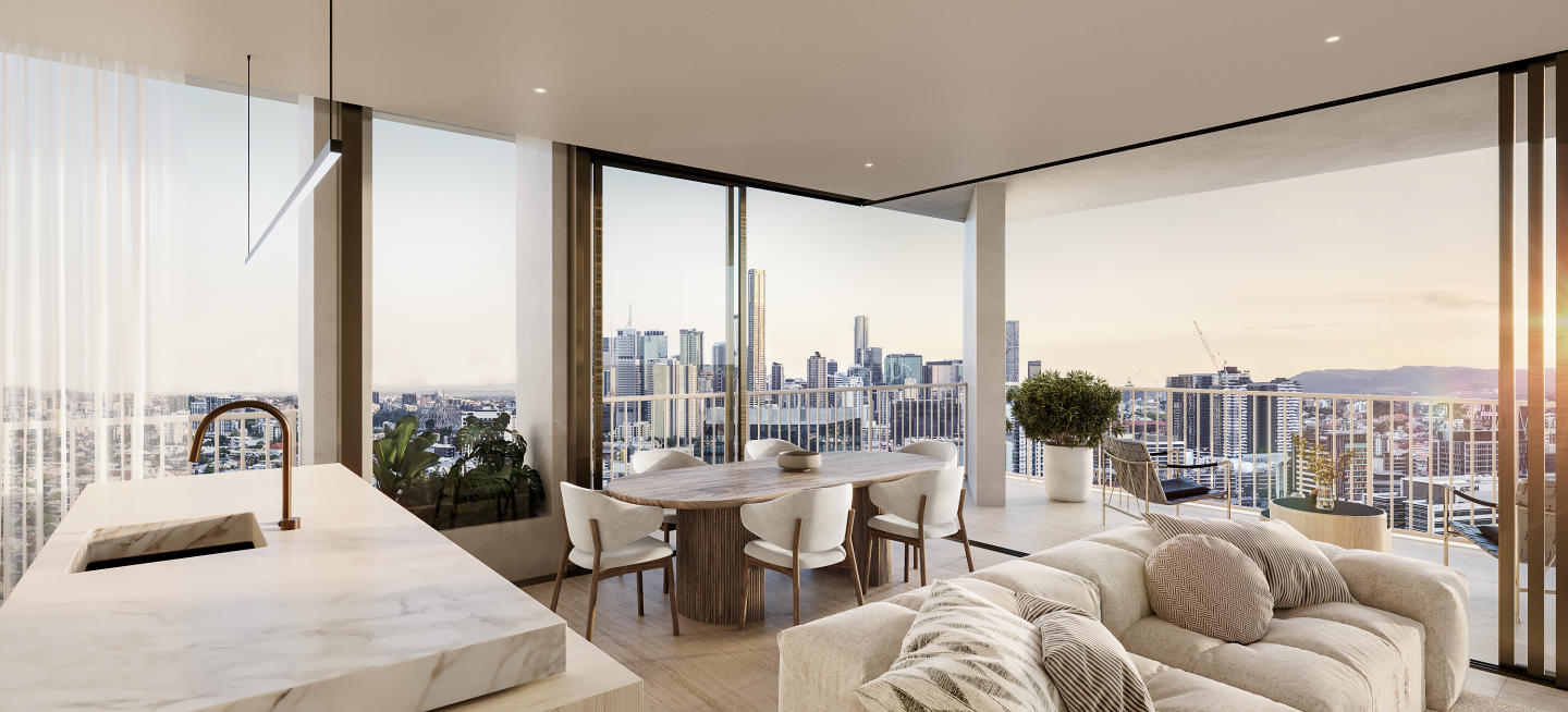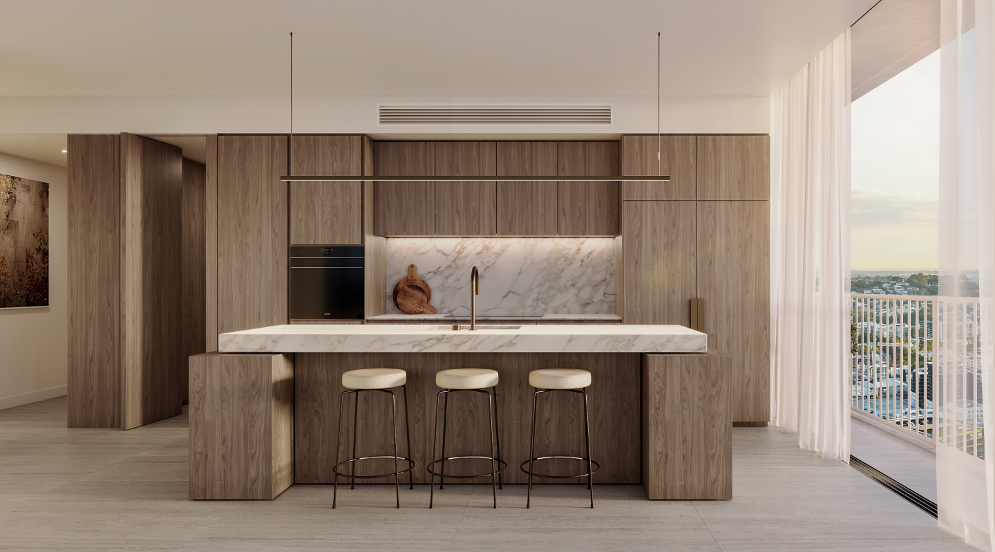 The residences at ORO Newstead are conceived as refined, private sanctuaries above the city, designed for long-term living. Generous proportions, thoughtful layouts and full-height glazing prioritise light, space and flow, framing expansive city and district views. A warm, enduring palette of travertine-inspired finishes, layered stone and natural timber tones creates calm, elegant interiors.