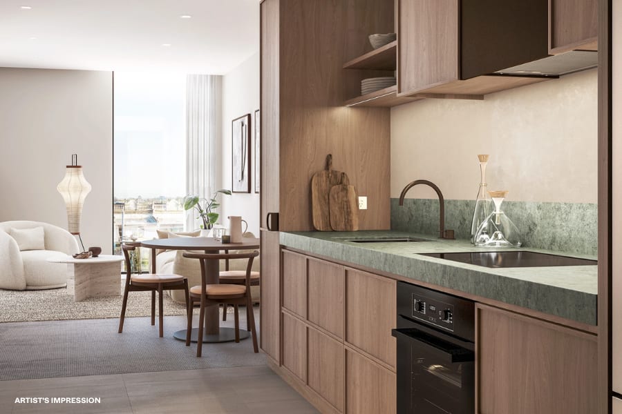 The impeccably crafted kitchens utilise natural materials in earthy shades, incorporating textured stone edges and curved island benches, paying homage to nature's subtleties.