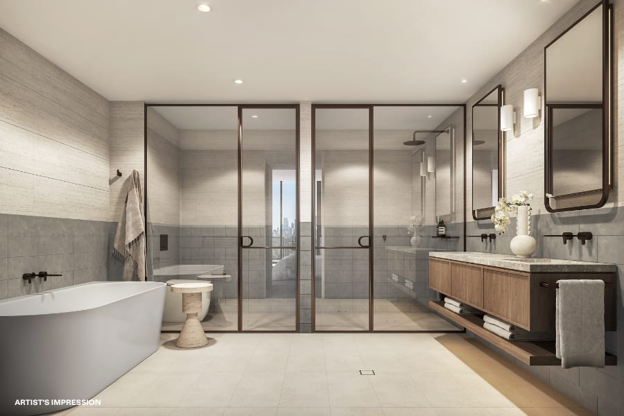Akin to a refined day spa, the bathrooms at Prince & Parade feature natural stone and soothing, earthy tones, providing a sanctuary to indulge the senses and elevate daily rituals into moments of luxury.