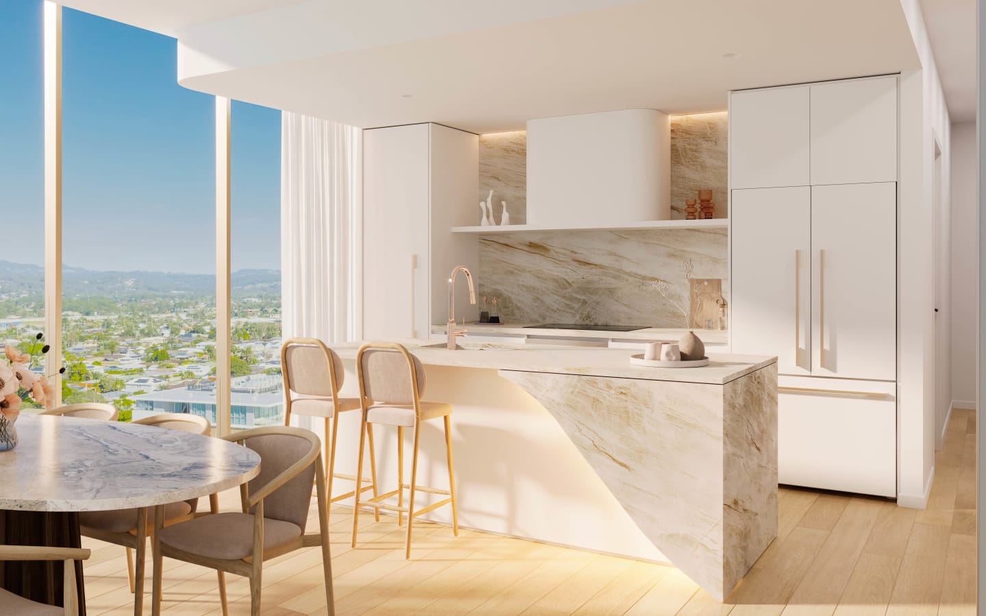 Each Retreat Palm Beach apartment boasts high‑quality finishes inspired by fluidity of the coastal landscape, brought to life with refined natural materials and a warm, muted palette. Interiors designed by Plus Architecture feature natural stone accents, textured concrete, timber screening and bronze detailing that foster a coastal, yet refined atmosphere. Kitchens are equipped with premium appliances, stone benchtops and integrated storage. Generous glazing invites natural light, framing ocean vistas while blending interior comfort and coastal calm.
