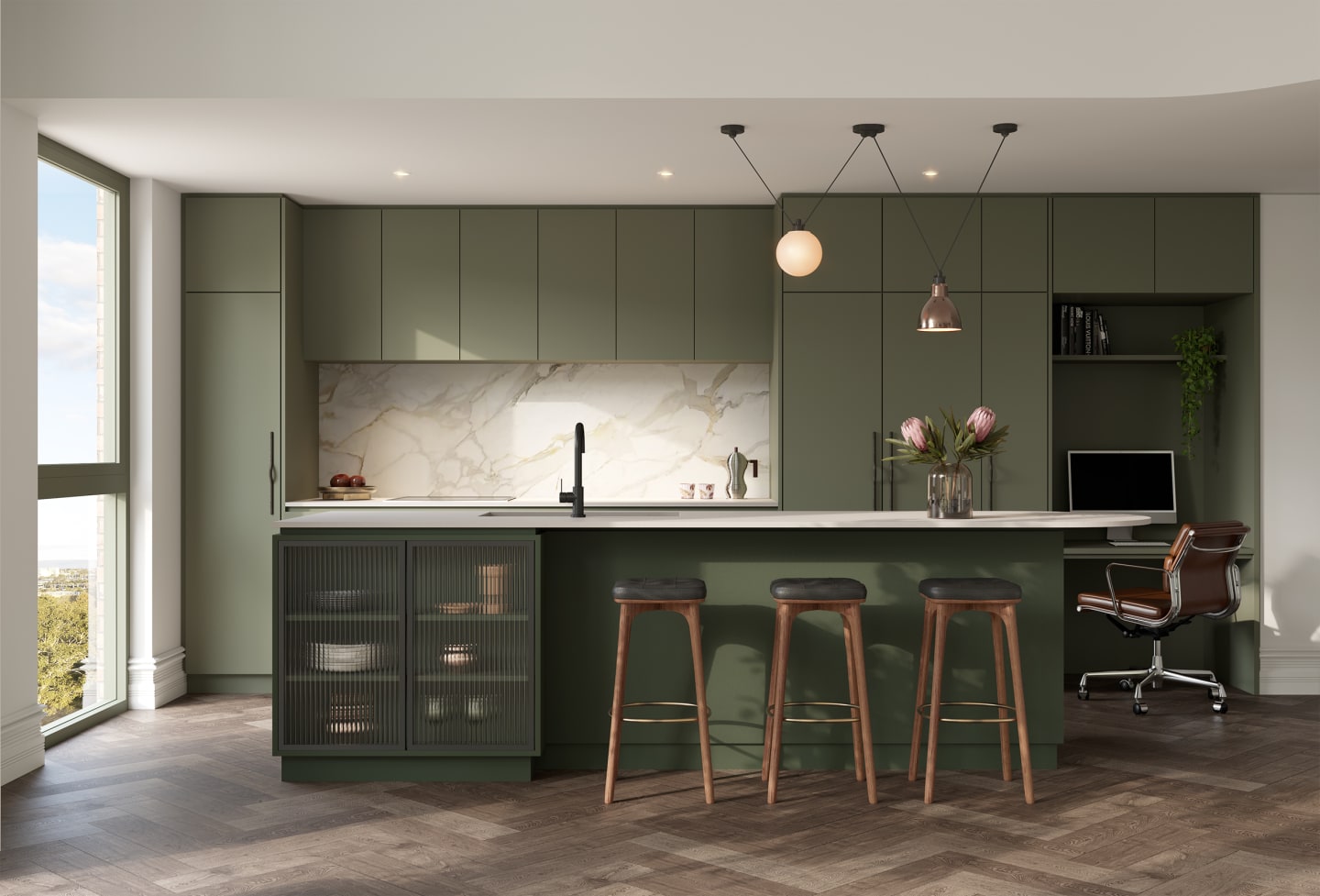 In the kitchen, designer feature pendant lighting creates both ambient and task lighting above the island, which feels like a feature furniture piece thanks to its broadline reeded glass door display. Residents can curate their own look with mixed metallic accents and detailing, while curved timber handles offer a soft and warm touch. Kitchens are equipped with high-quality Miele appliances with custom cabinetry that provides ample storage while adding a touch of elegance. Bathrooms are designed as private sanctuaries with brushed nickel tapware, terrazzo riverbed porcelain floors, and luxurious custom joinery, creating a refined hotel-like feel.