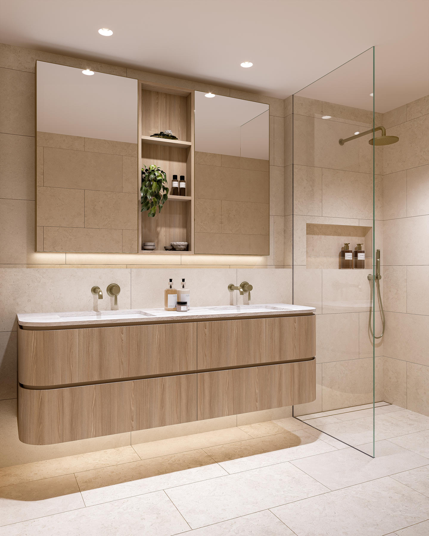 Each kitchen is a culinary masterpiece, featuring beautiful stone benchtops and splashbacks, Miele appliances, a five-burner cooktop, and an integrated refrigerator and dishwasher. These spaces are designed for those who appreciate both functionality and beauty. The luxury extends to the bathrooms, where custom finishes such as brushed brass fixtures, heated towel railings, and double vanities provide a spa-like experience. Most residences offer three bathrooms, plus a powder room, ensuring every comfort is met.