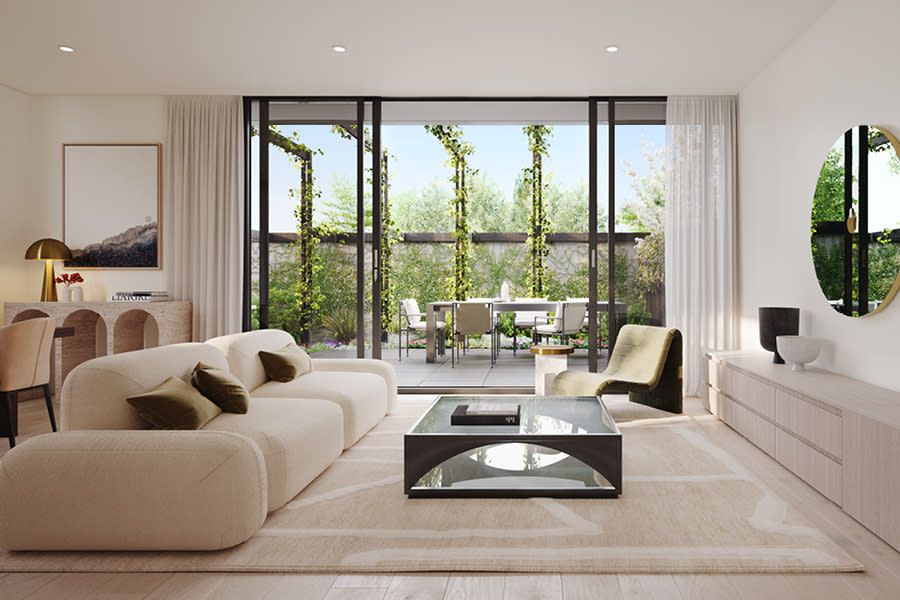 Every townhouse at Veil Brighton enjoys a private courtyard- a peaceful retreat defined by soft greenery and sculpted form. Thoughtfully composed landscapes by John Patrick Landscape Architects complement the architecture with texture and natural serenity, creating an exclusive garden setting unique to each home.