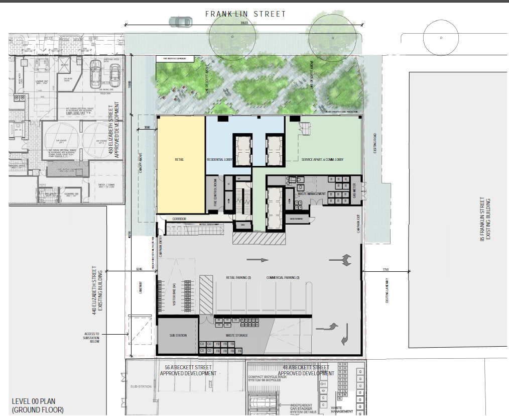 The proposal looks to provide a positive and meaningful contribution to the public realm by way a new north facing "urban forest" at ground level, running along the 40m frontage to Franklin Street. This is achieved by employing a 10m setback to the street with a 5m setback from the western boundary allowing for a new north-south laneway between the site and 450 Elizabeth Street.