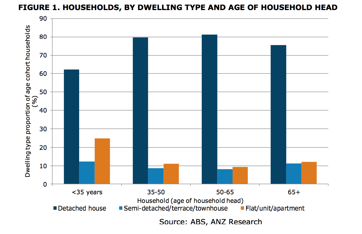 "An ageing population will depend less on income and more on financial wealth to support home ownership choices. Figure 1 shows the most recent data on households by dwelling type, from 2011. It reveals a strong bias towards detached housing, particularly amongst age groups over 35 years. Higher-density housing is more common among under 35s (37%) and over 65s (23%).