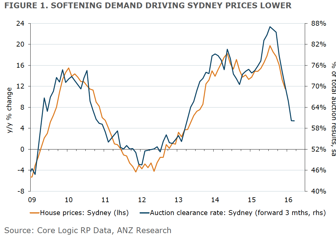 Prices are being driven by softer demand and sentiment in the housing sector. Tighter regulation and higher interest rates have contributed to auction clearance rates falling from their recent peak. As clearance rates dipped further in December, to a three-year low in Sydney, house prices have been correspondingly soft (Figure 1).