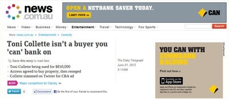 And hasn't Academy Award-nominated actor Toni Collette been in our faces this week with the CBA can/can't ad campaign. Of course Title Tattle has been following her many property plays of late and next week her property settlement legal proceedings will be back in the Supreme Court list. Title Tattle revealed the likely quantum of the claim for non-performance of her once intended Paddington terrace. Collette and her musician husband, David Galafassi were set to pay $6.35 million for the Stewart Street house, which resold this week for about $5.5 million through McGrath agent Ben Collier. It's not known what defence the entertainment industry couple will mount to explain their alleged contractual non-performance. The new owner of the Paddington terrace is Ian Ball, the Ernst and Young accountant and chief executive officer of the International Federation of Accountants. And hats off to the Sydney Confidential sub-editors and advertising reps at the Daily Telegraph for their co-ordination!
