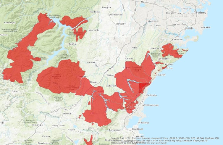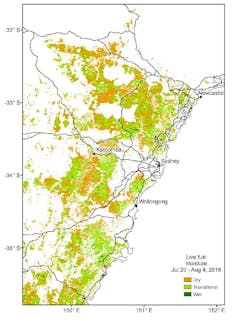 Current dry conditions are reflected in the maps of live fuel moisture produced by Dr Rachael Nolan of Western Sydney University.