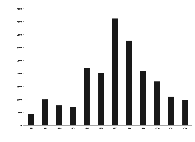 Estimated NSW fishing licence holders 1881-2016 Wilkinson, 2013, Wilkinson, 1997 and NSW Department of Primary Industries