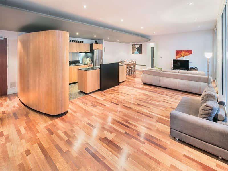 It’s an unusual offering to the market, with redgum floors and huge open spaces. It includes a library and two undercover car spaces, and there is a roof deck with views over the city.