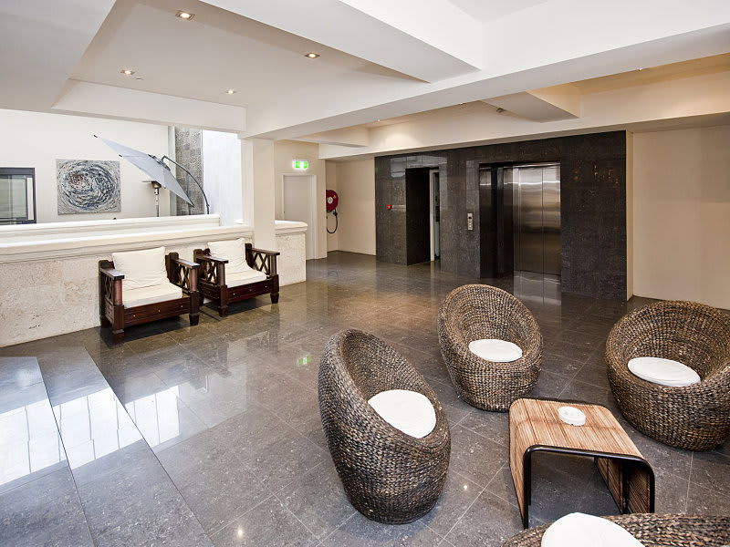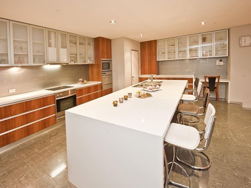 A timber panelled elevator takes the occupant to a private lobby to enter the property, which has timber floorboards and glass/steel atriums.