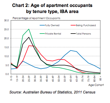 The age profile of apartment residents suggests that people first rent when moving into the IBA area, with 47 percent of occupants in rental households aged 20 to 29 years old. If people remain in, or move into, the IBA area beyond 30 years of age, there is a higher propensity to purchase an apartment.