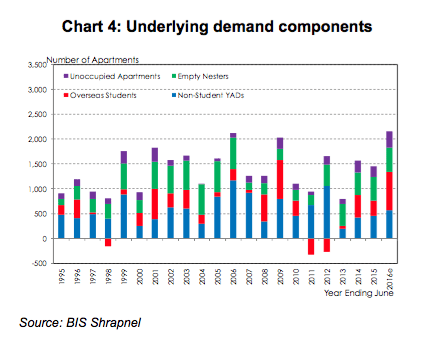 An analysis of the age profile of apartment residents suggests three main groups driving occupier demand: students, younger adults, and older empty nester adults.