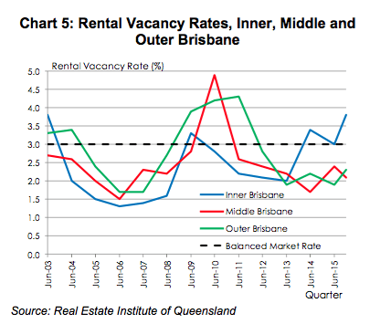 Vacancy rates in Inner Brisbane remained below the balanced market rate of 3 percent from June 2004 through to June 2013, except at June 2009, when a rapid reduction in standard variable rates and the introduction of boosted incentives to first home buyers during 2008/09 encouraged existing and potential tenants to become owner occupiers.