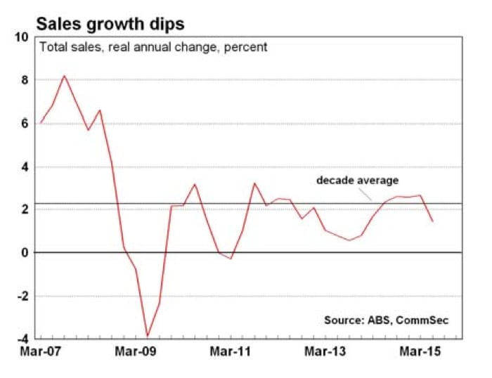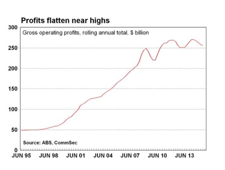 In the year to June (2014/15 year), profits totalled $255.8 billion, down 5.4 per cent over the year and the biggest annual decline in just over two years. Non-mining profits rose by 2.2 per cent to a record $184.7 billion in 2014/15.The value of all sales by industry fell for only the first time in nine quarters, down by 0.2 per cent in real terms in the June quarter to be 1.4 per cent higher than a year ago. In the March quarter sales were growing at the fastest pace in 31⁄2 years.