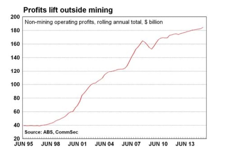 Company operating profits fell for the fifth straight quarter, dropping by 1.9 per cent in the June quarter. Profits fell in 10 of the 15 industry groups. Profits fell by 9.9 per cent in Mining, fell by 0.8 per cent in Manufacturing and fell by 4.7 per cent in Construction. But profits rose by 3.3 per cent in Retail Trade.