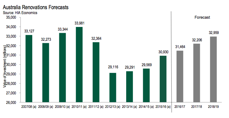 “Dwelling renovations are forecast to grow over the forecast period counteracting some of the decline in the new home building activity. By 2018/19 renovations are forecasts to have grown by 6.5 per cent to be worth $32.96 billion in that year."