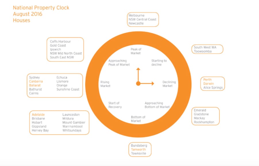 The NSW Central Coast house market is peaking along with Melbourne and Newcastle, according to the August property clock from Herron Todd White.