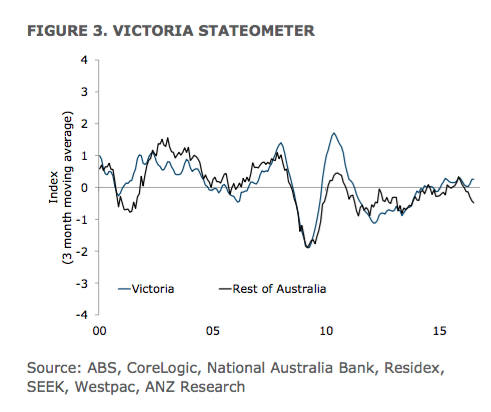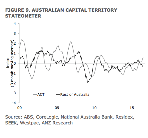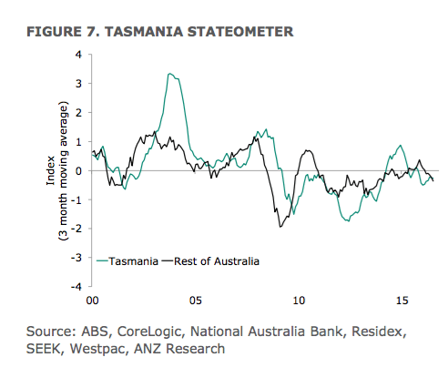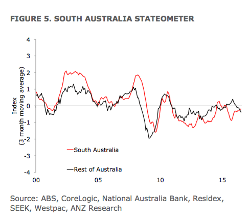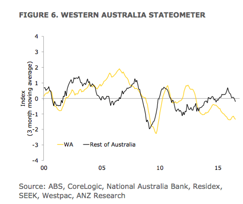 The Stateometer suggests that Victoria’s economy is growing at a slightly above-trend rate. Queensland’s growth has stabilised at a well-below trend rate, fully unwinding the significant improvement in late 2015. Growth in Western Australia remains very weak, with the recent small improvement unwound.