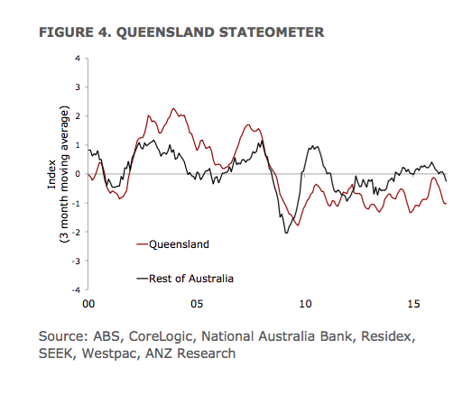 - Queensland’s economic growth has been steadily decelerating over the past few months and is now well below trend. This means that the index has fully unwound the significant improvement in late 2015.