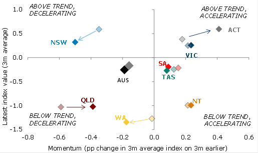 - The smoothed New South Wales index remains positive, suggesting economic activity is expanding at above trend pace.