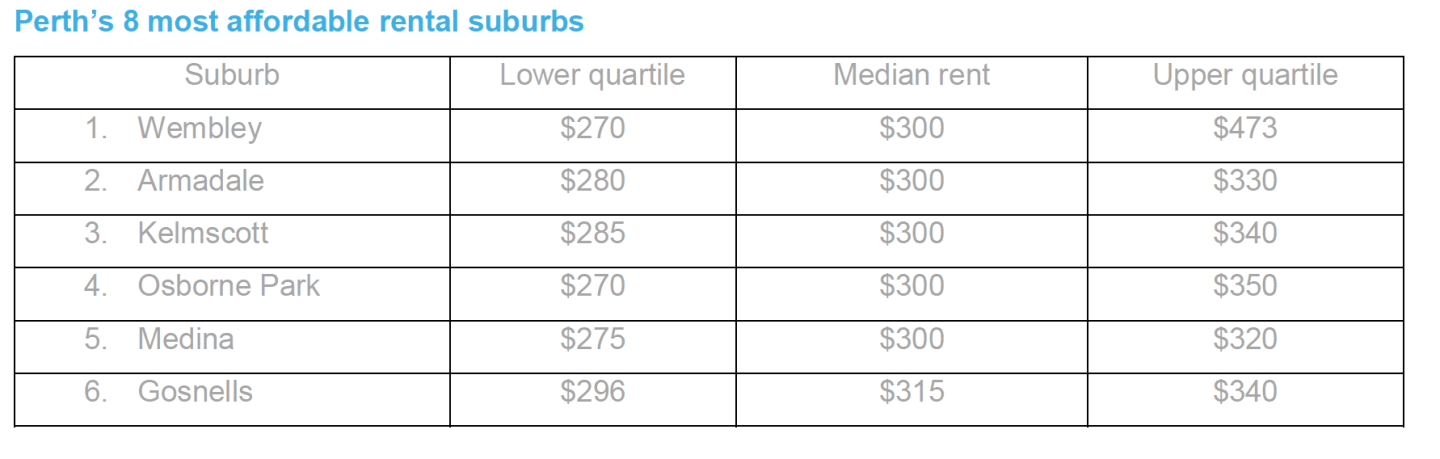 Perth tenants looking for affordable rentals should look to suburbs like Wembley, Armadale and Kelmscott which topped reiwa.com’s list of the most affordable suburbs to rent in for the three months to February 2016.